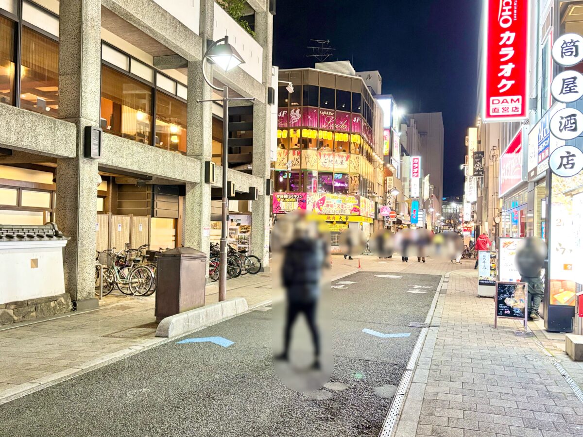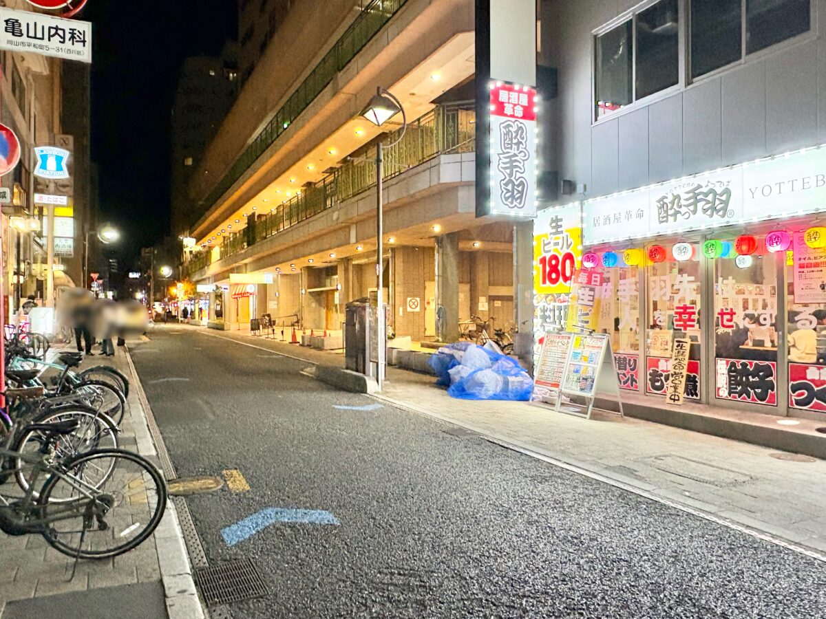 このビルの左には、かに道楽があってまっすぐ行くと岡山駅の方です。