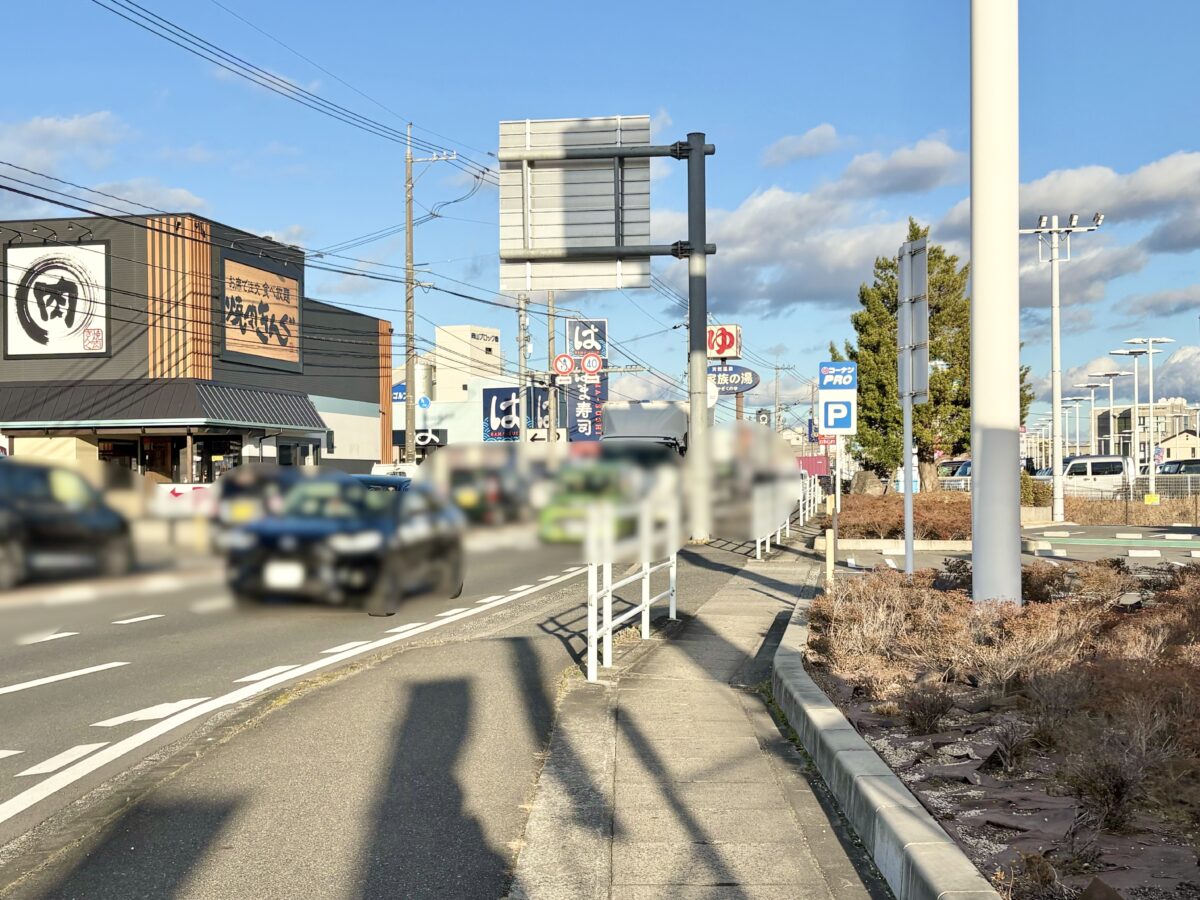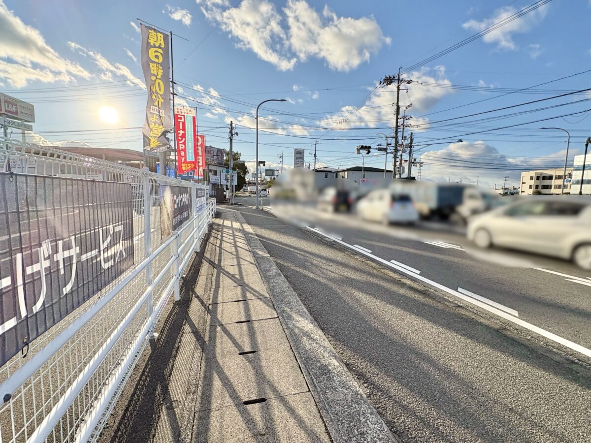 お店から見て左には久米交差点があって庭瀬駅方面です。