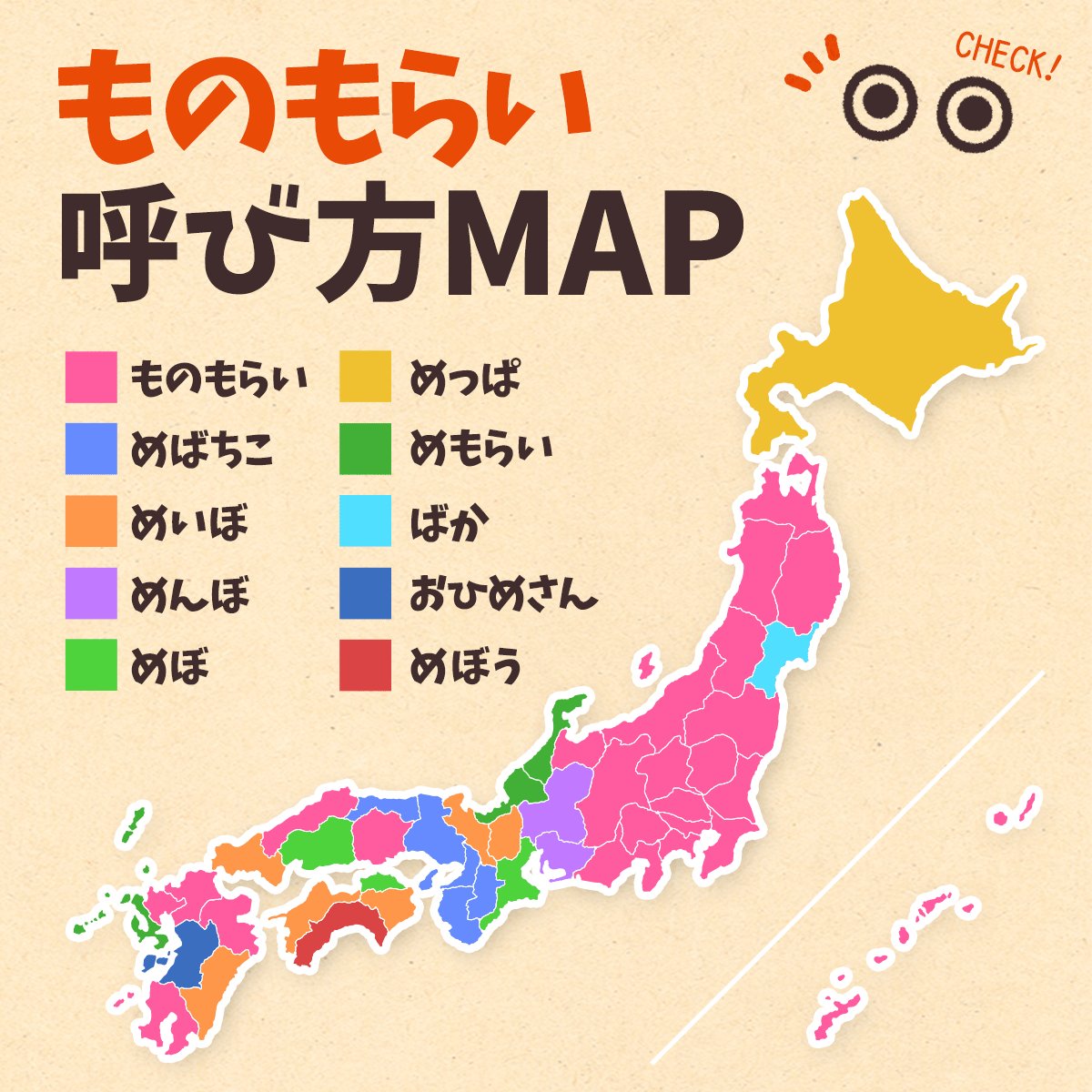 ロート製薬の「ものもらいmap」によりますと、「ものもらい」は関東に多い呼び方で、「めばちこ」は関西に多い呼び方なんだそうですよ!