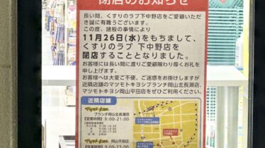 【岡山市北区】御南公園ちかくの「くすりのラブ下中野店」が11月26日で閉店するみたい