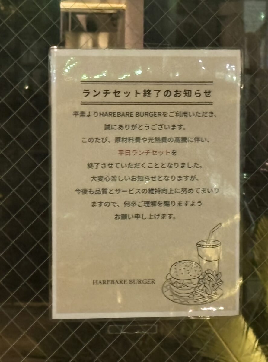 上記貼紙によると「Hare Bare Burger」さんでは原材料費や光熱費の高騰に伴い終了したとのこと。