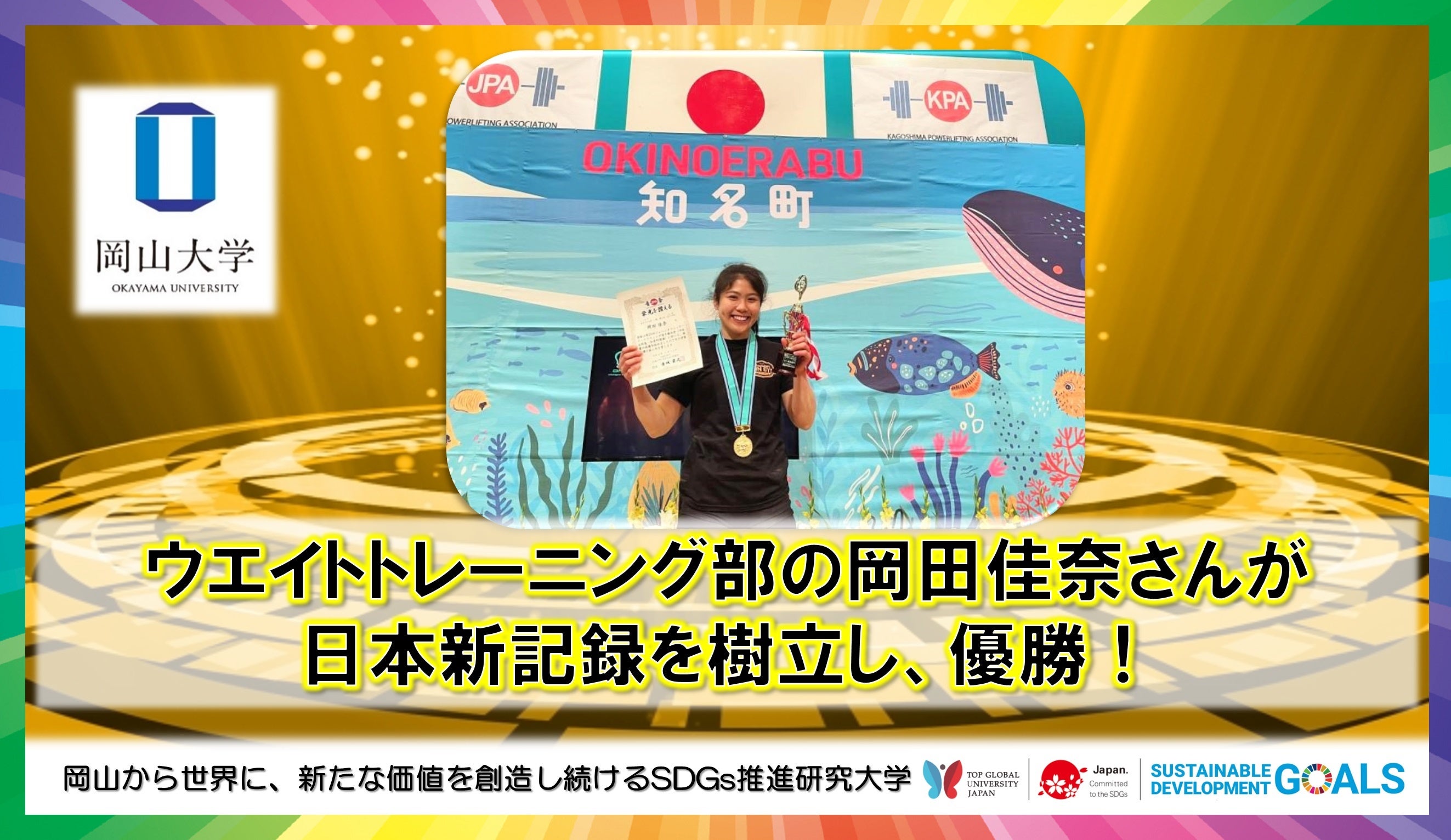 2022年3月12日13日鹿児島県で開催された「第26回ジャパ ンクラシックパワーリフティング選手権大会」一般女子63キロ級で岡山大学ウェイトトレーニングの「岡田佳奈」さんが優勝したそ うです。