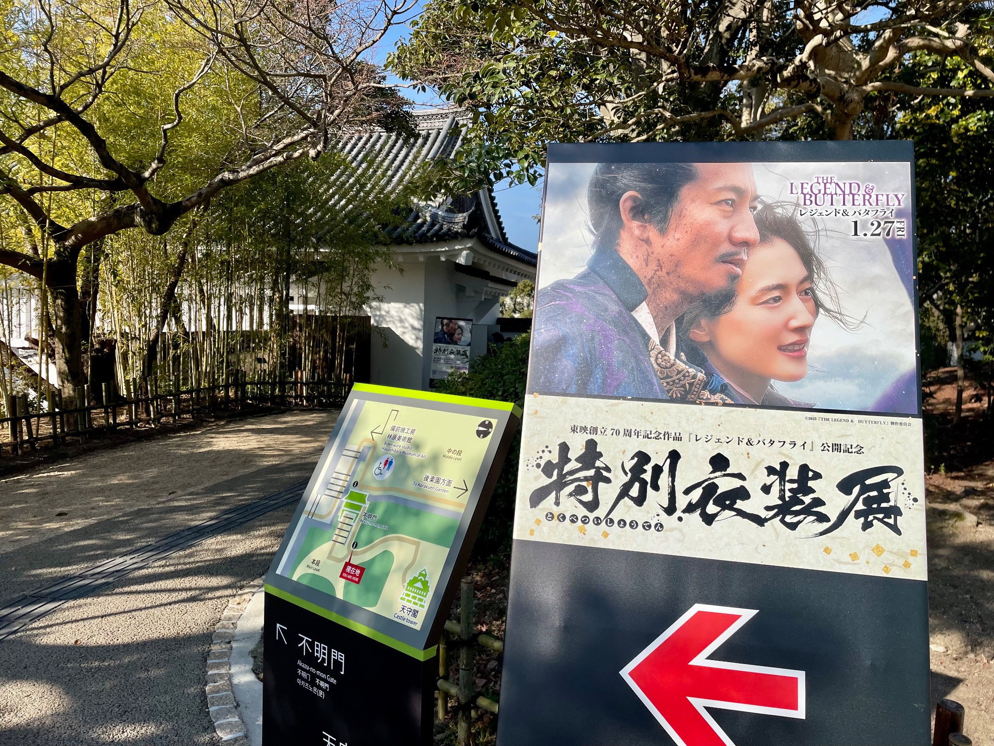 2023年2月9日より映画「レジェンド&バタフライ 特別衣装展」が岡山城・不明門で始まっています。