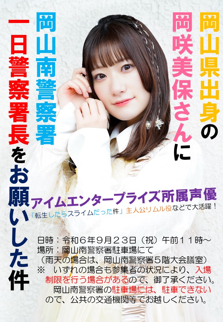 岡山出身の声優「岡咲美保」さんが岡山南警察署の1日署長をやるそうな。9月23日