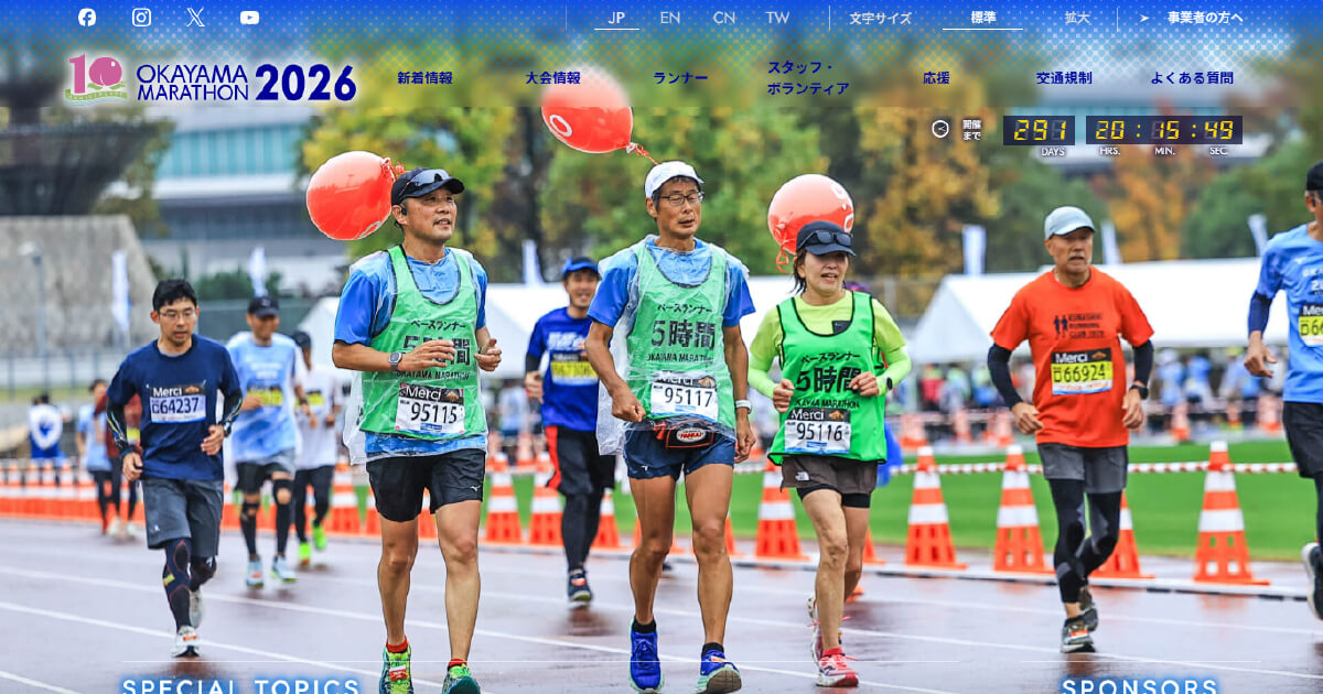 おかやまマラソン2026の公式ホームページです。おかやまマラソン2026は、2026年 11月8日(日)に開催します。フルマラソンのコースは、岡山城や日本三名園の一つ 岡山後楽園などの観光拠点の周辺を巡るほか、豊かな水と緑の空間も楽しめる日...