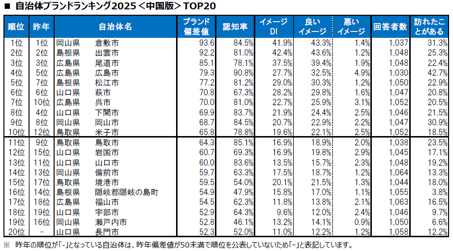 今年も倉敷市が1位!いい部屋ネット 自治体ブランドランキング2025<中国版>