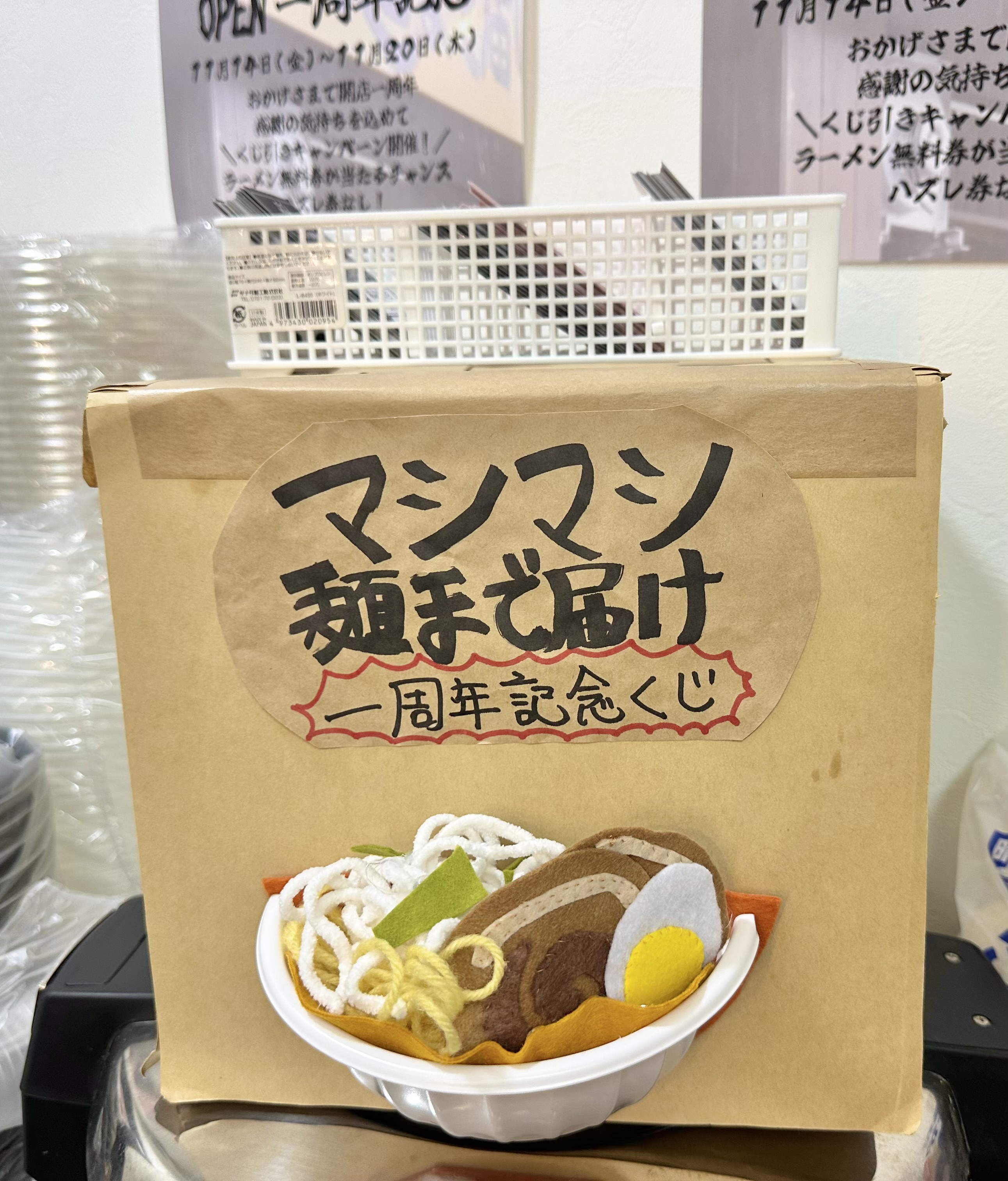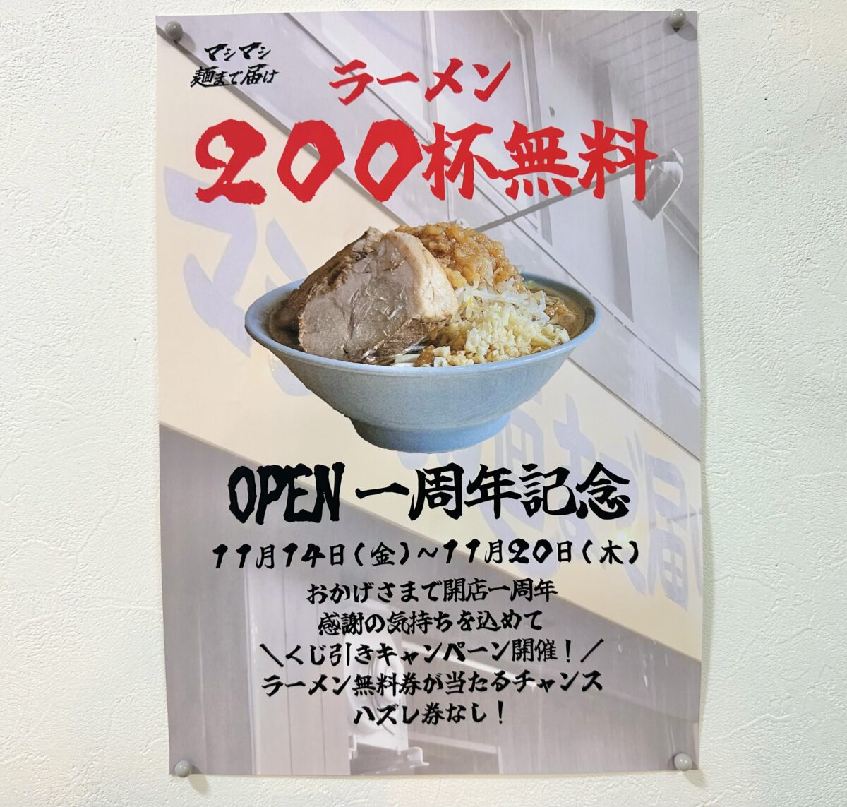 【岡山市北区】二郎系ラーメン店「マシマシ麺まで届け」がオープン1周年。ラーメン200杯無料くじ引きキャンペーンやるみたい