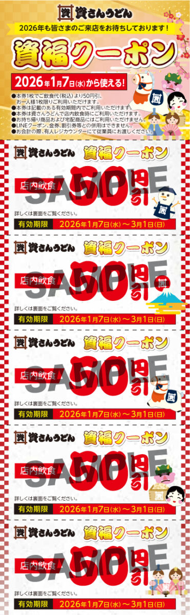 資さんうどんが全店で使用できる「店内飲食50円引」5連クーポンを配布しているようです。